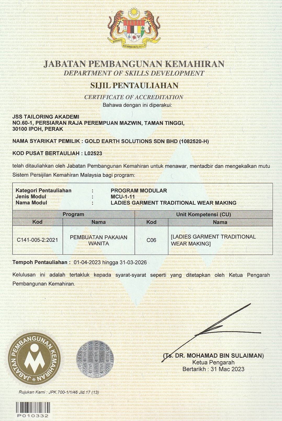 JSS Tailoring Akademi merupakan penyedia latihan kemahiran jahitan yang menawarkan program Persijilan Kemahiran Malaysia (SKM) melalui dua kaedah iaitu sijil penuh dan micro credential. Program ini memberi tumpuan kepada latihan praktikal dan teori berasaskan TVET bagi membantu peserta menguasai kemahiran jahitan serta meningkatkan peluang kerjaya dan keusahawanan dalam industri jahitan dan fesyen.
